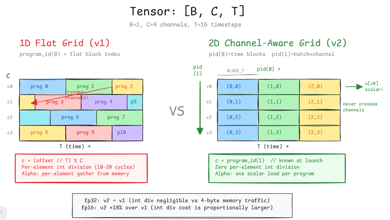 this means each program is responsible for processing a small time slice of a single (b, c) pair. because the channel is already known from the launch index, the kernel no longer needs to compute it via division.