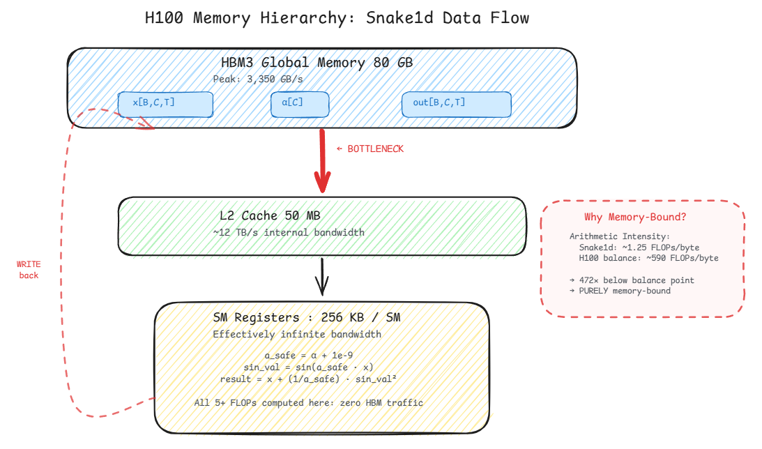 in this worklog we incrementally optimized snake1d activation from a sequence of HBM round-trips into a single fused triton kernel that performs all computation in registers.