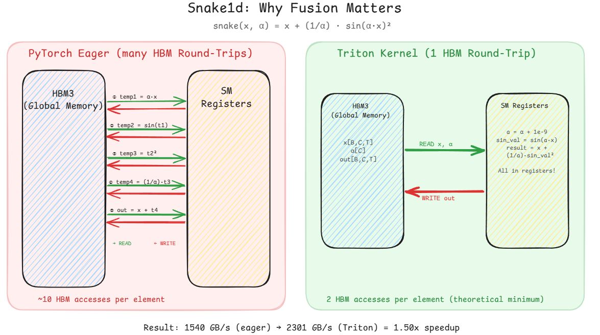 eager torch writes intermediate results to HBM between each operation. the triton kernel reads once, computes everything in registers, and writes once to HBM.