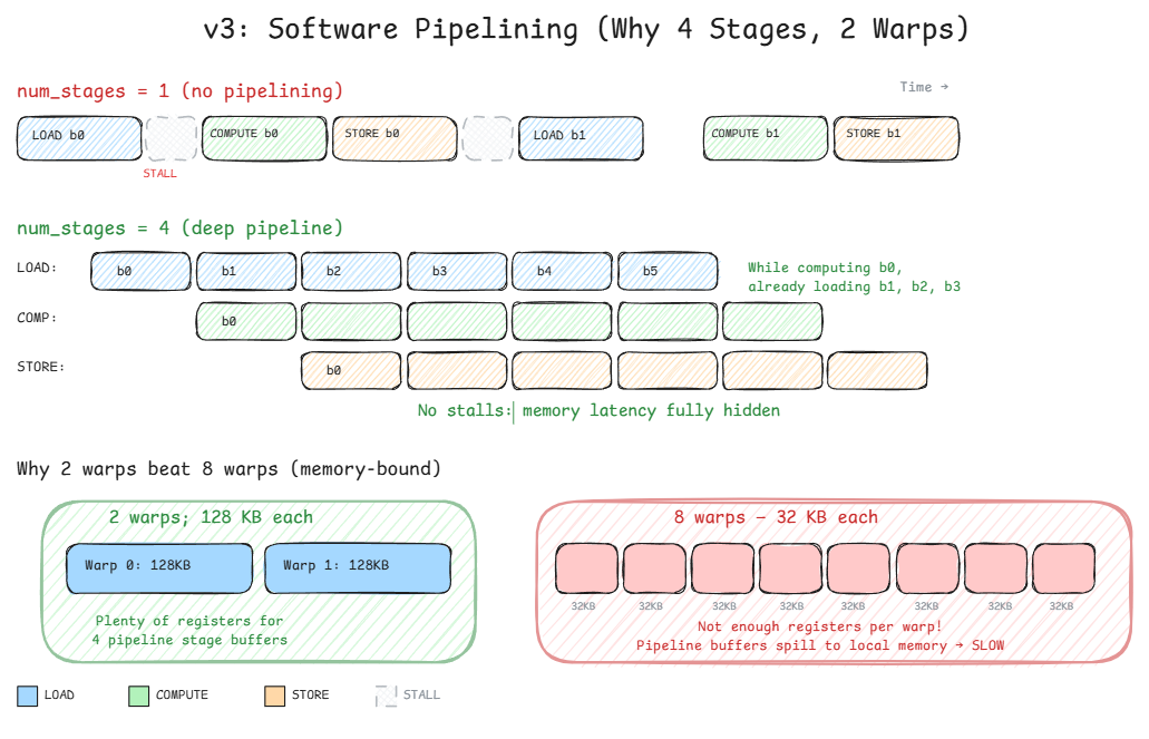 a lower warp count reduces register pressure per SM, which helps maintain higher occupancy. meanwhile, deeper software pipelines allow triton to issue memory loads earlier and overlap them with computation, improving the GPU’s ability to hide HBM latency.