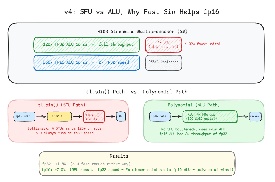 the H100 has only 4 SFU units per SM vs 128 FP32 ALU cores. tl.sin() always runs at fp32 speed through the SFU. the polynomial approximation routes through the much wider ALU datapath, which is 2x faster for fp16.