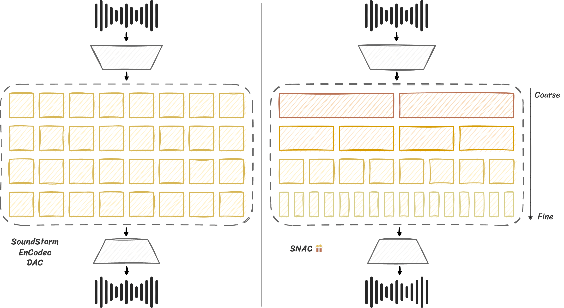 SNAC compresses audio into hierarchical discrete tokens using RVQ (right)